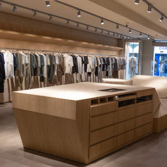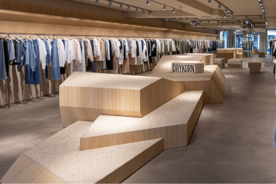 Auftrag: Realisierung des Drykorn Ladenbau-Konzeptes mit Möbeloberflächen aus Steinteppich