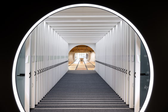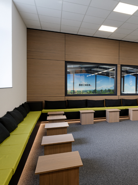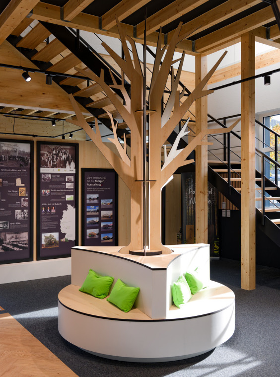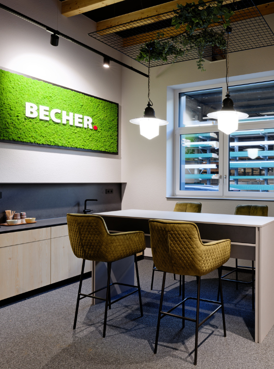 Technisch anspruchsvolle Elemente wie die Empfangstheke aus Hi-Macs treffen auf die integrierte Holz Becher-Firmengeschichte.