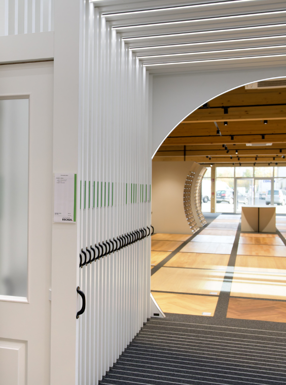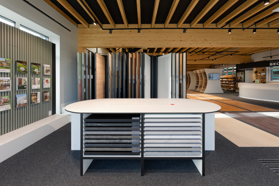 Entstanden ist ein Umfeld, das die Vielfalt der Materialien präzise inszeniert. Weiß beschichtete Faserplatten sorgen dafür, dass Farben und Oberflächen der Muster klar wirken. Der rote Becherpunkt bildet das gestalterische Fundament und zieht sich konsequent durchs Konzept. Er steht damit im Kontrast zum ausgestellten Plattenmaterial.