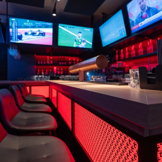 VIP-Lounge und Thekenanlage – mit diesen zwei Ladenbauelementen und Sonderanfertigungen sind wir Teil der Tipico Sportsbar in Karlsruhe. Ein Schmuckstück im neuen Tipico-Konzept ist die von uns produzierte VIP-Lounge mit integrierten Sitzbänken, Tisch und großem Screen: Rund angelegt, erhöht auf einem Podest und mit drei Eingängen versehenen, kann die Lounge von kleinen Gruppen gemietet werden. Den Bartresen haben wir nach Plänen von Tipico gebaut und die Thekenfront mit hinterleuchtetem Tipico-Dekor versehen.